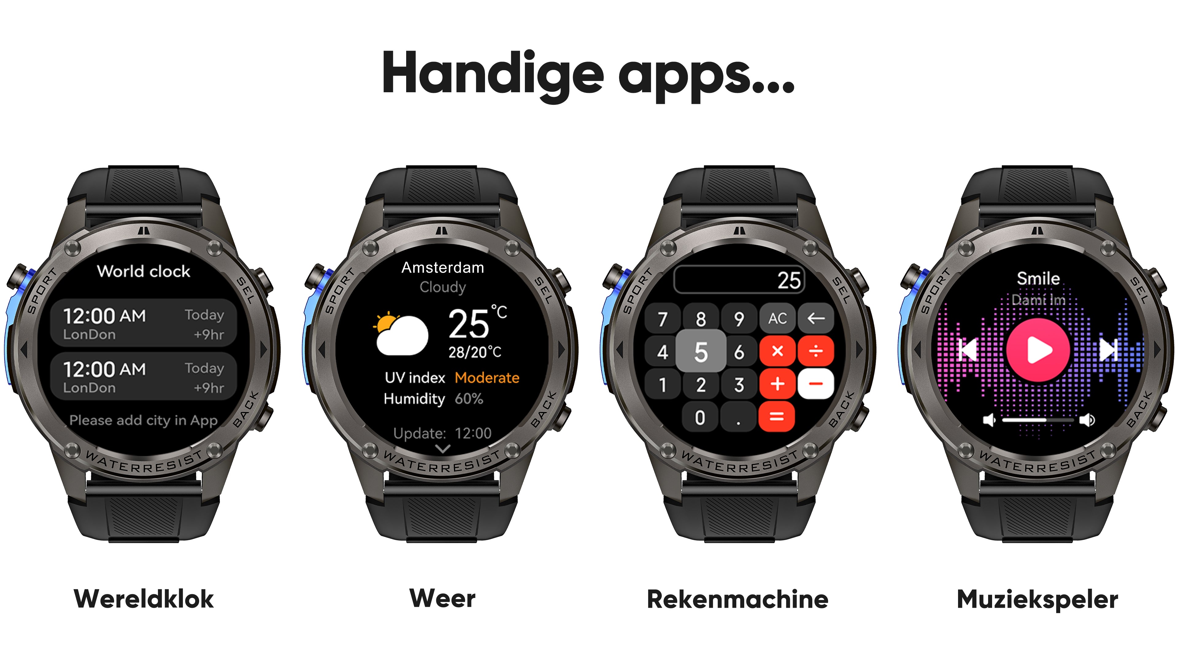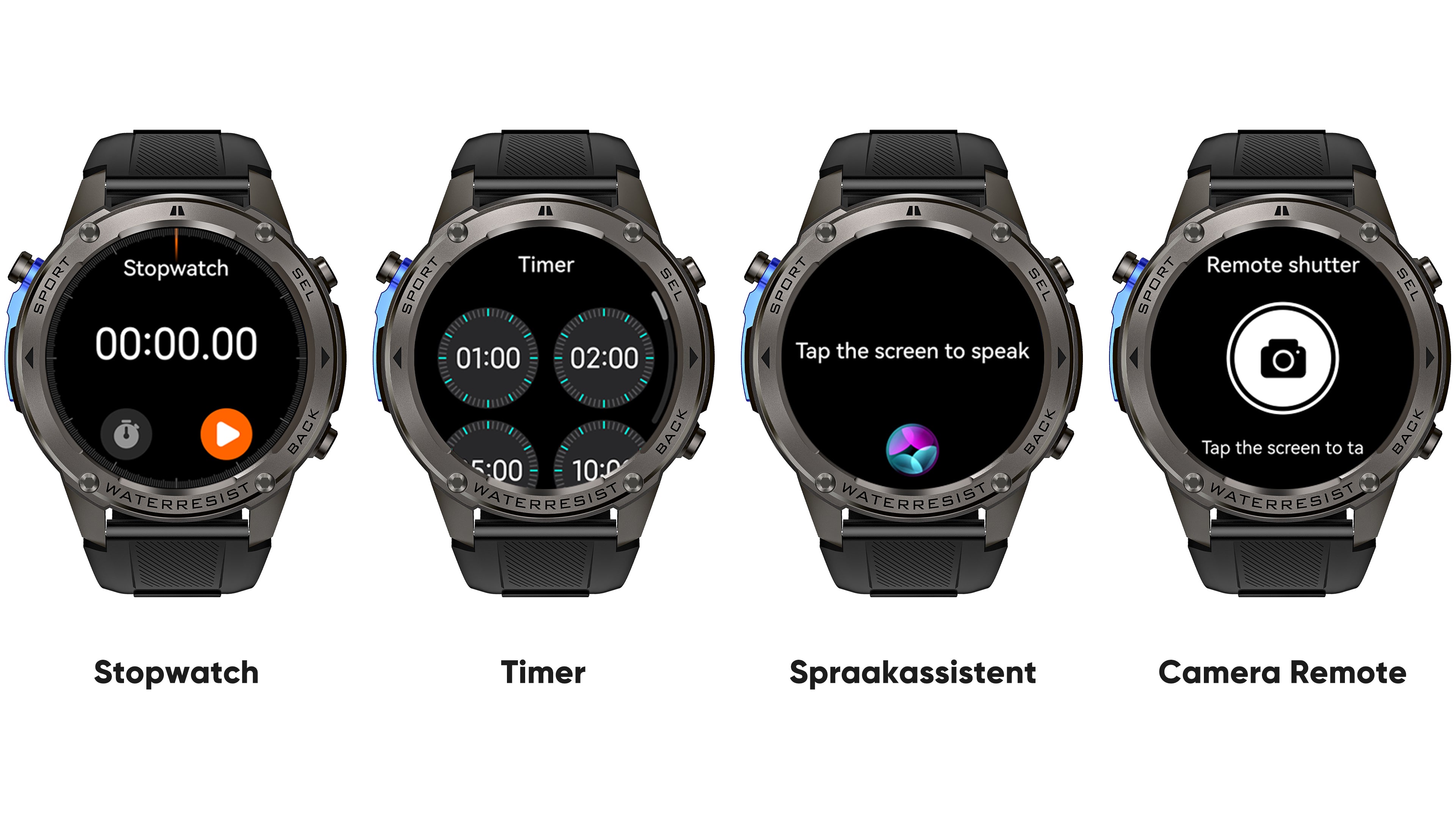 | SMART FEATURES | Flashlight World Clock Vibration function SOS function Music player Voice assistant Find phone Always On Display Camera control Automatic lighting screen |